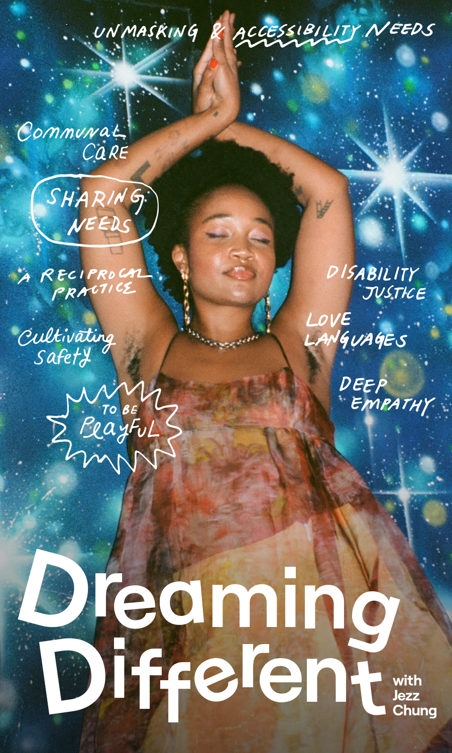 Cover art for this episode of Dreaming Different features a portrait of Kimberly, a Black woman with a short fro. Her eyes are closed and she has her hands raised above her head. Floating around her, topics and themes from the conversation: unmasking & accessibility needs, communal care, sharing needs, a reciprocal practice, cultivating safety, to be playful, deep empathy, love languages, disability justice. At the bottom, cold white text reads: Dreaming Different with Jezz Chung.