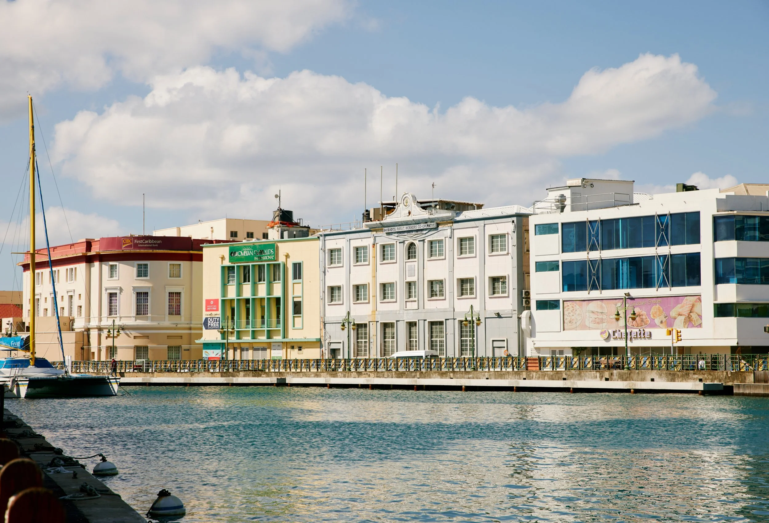Buildings on Wharf Road sit behind the mouth of the Constitution River/Bridgetown Wharf/The Careenage.