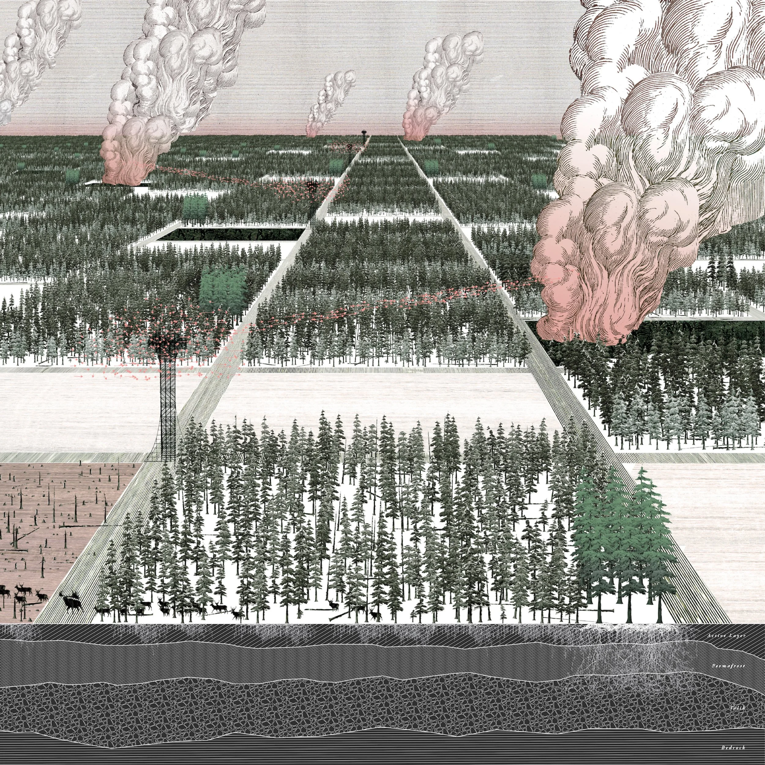 This is perhaps an opportune moment to segway into the role of the section drawing, which figures prominently throughout Climate Inheritance and the larger body of your work to reveal the underlying workings, and unworkings, of the climate crisis. Can you expand on the generative potential of the section in your work?